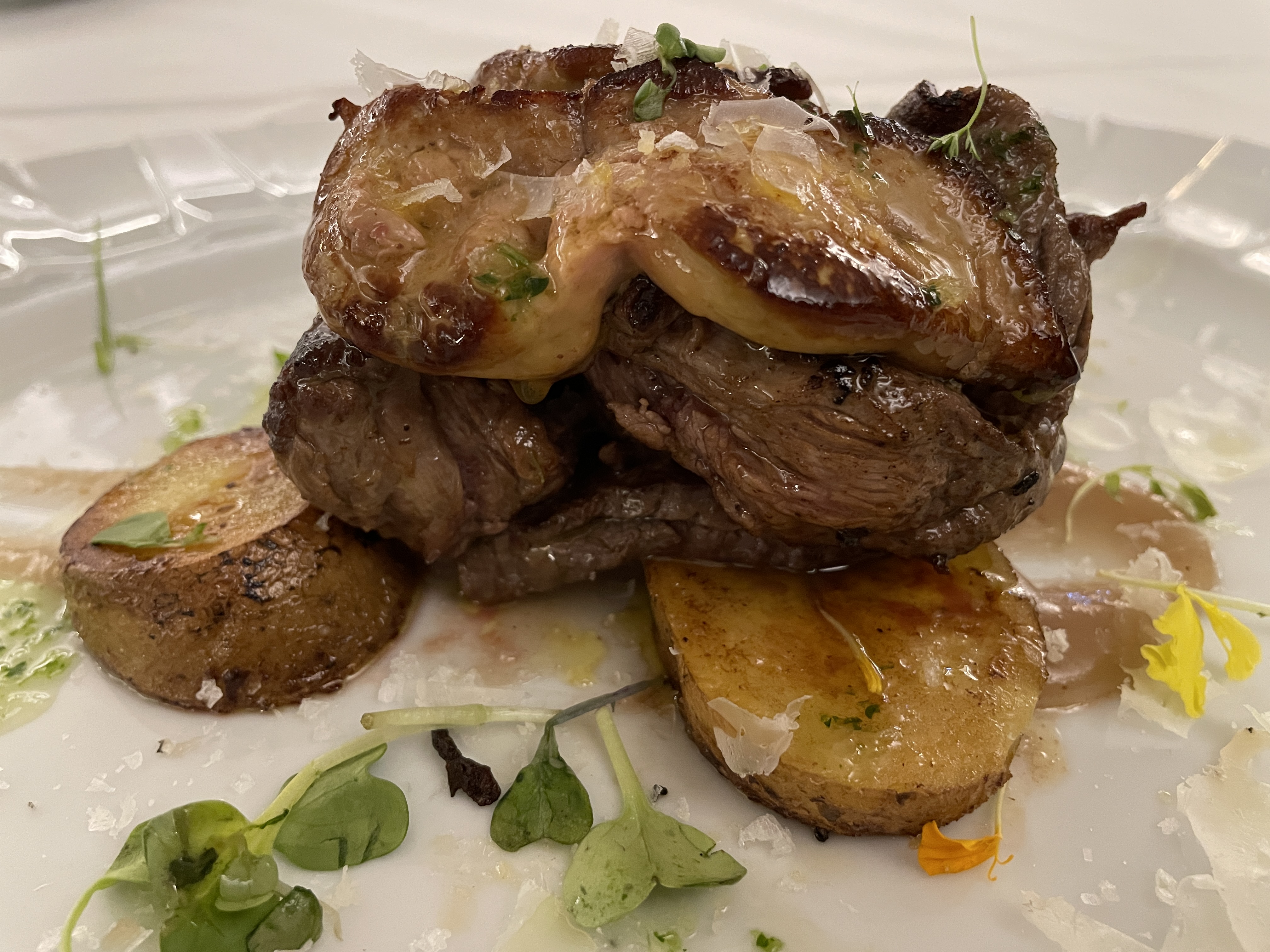 밤 소스를 곁들인 쇠고기 안심, 구운 푸아 만체고 치즈 조각이 올라간 메인이 나왔다.