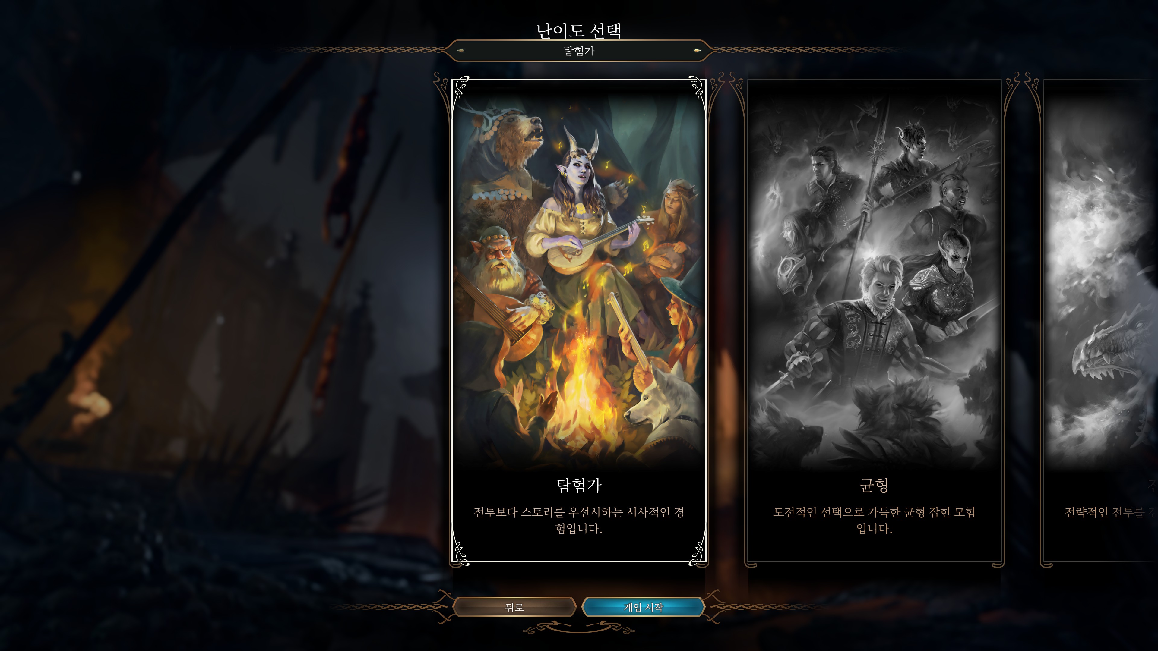 일전에 CRPG 다른 게임 몇 번 시도했다가 실패한 경험이 있어서 일단은 가자 쉬운 난이도인 탐험가로 선택했다.