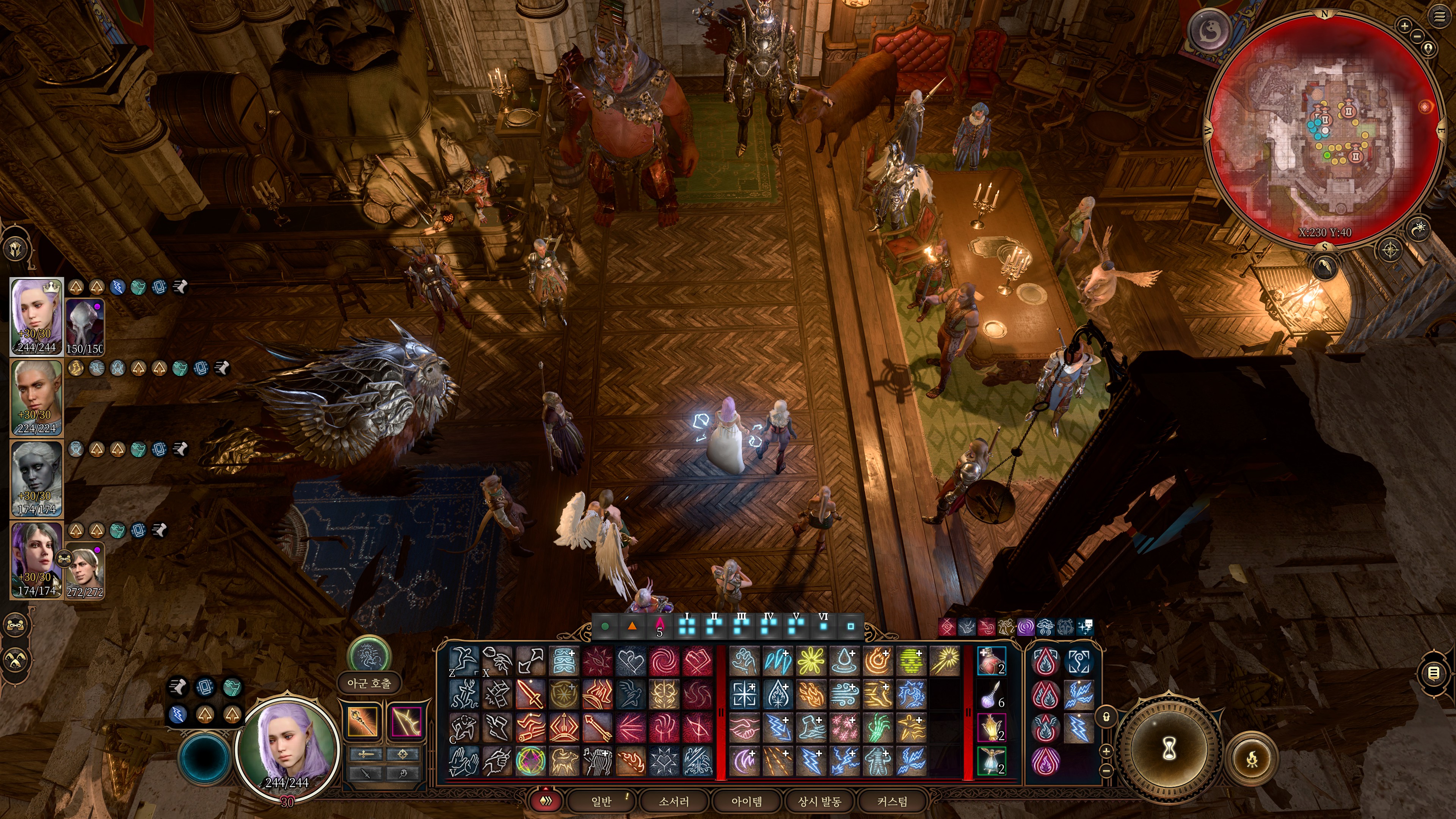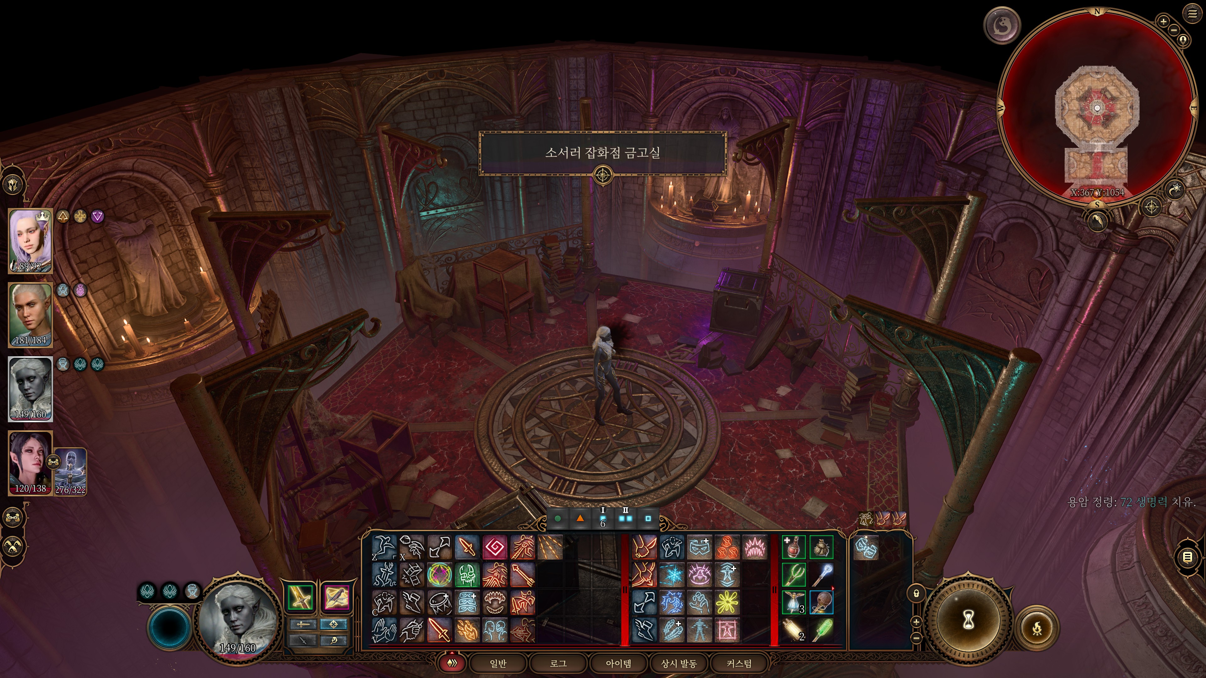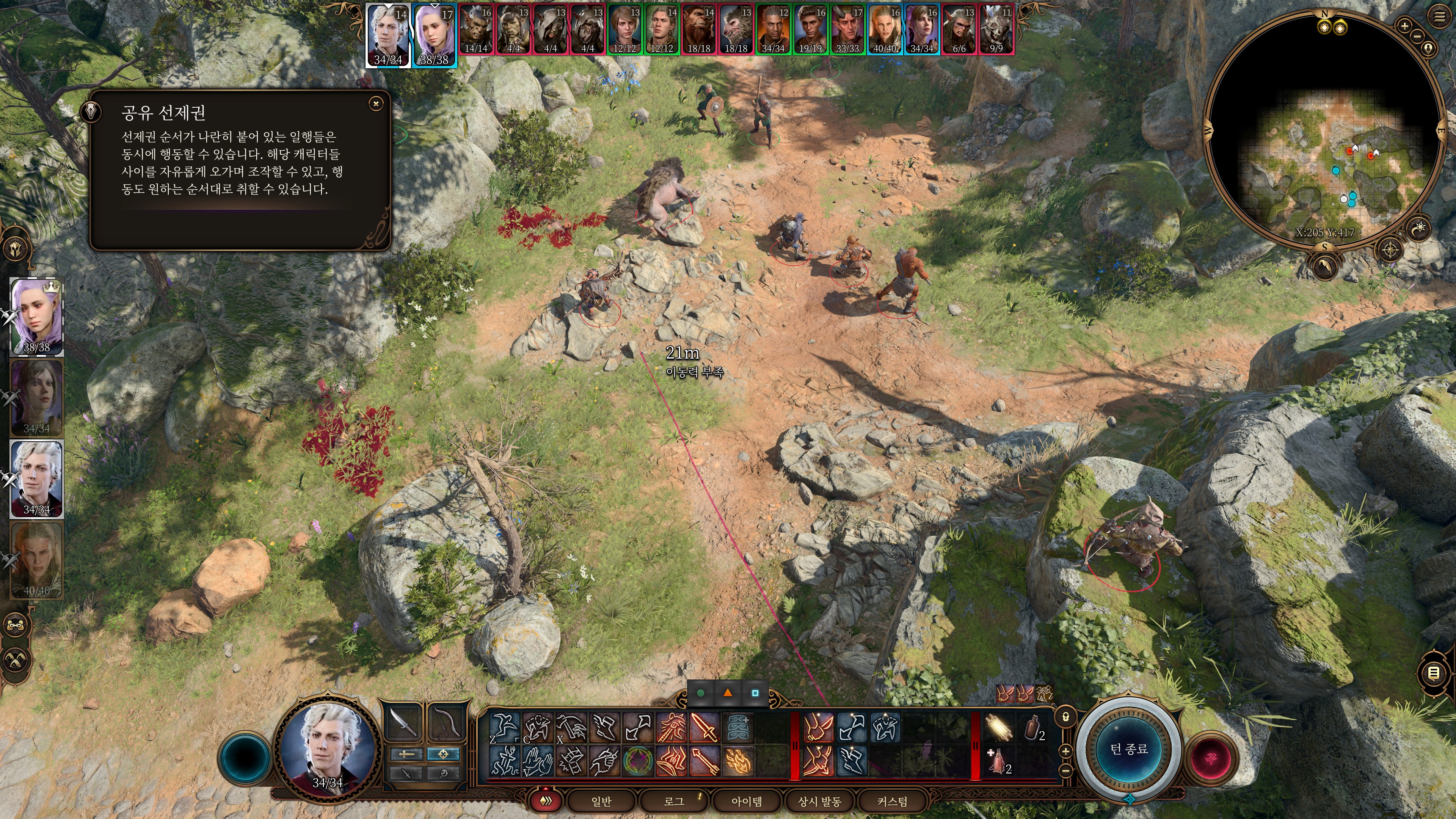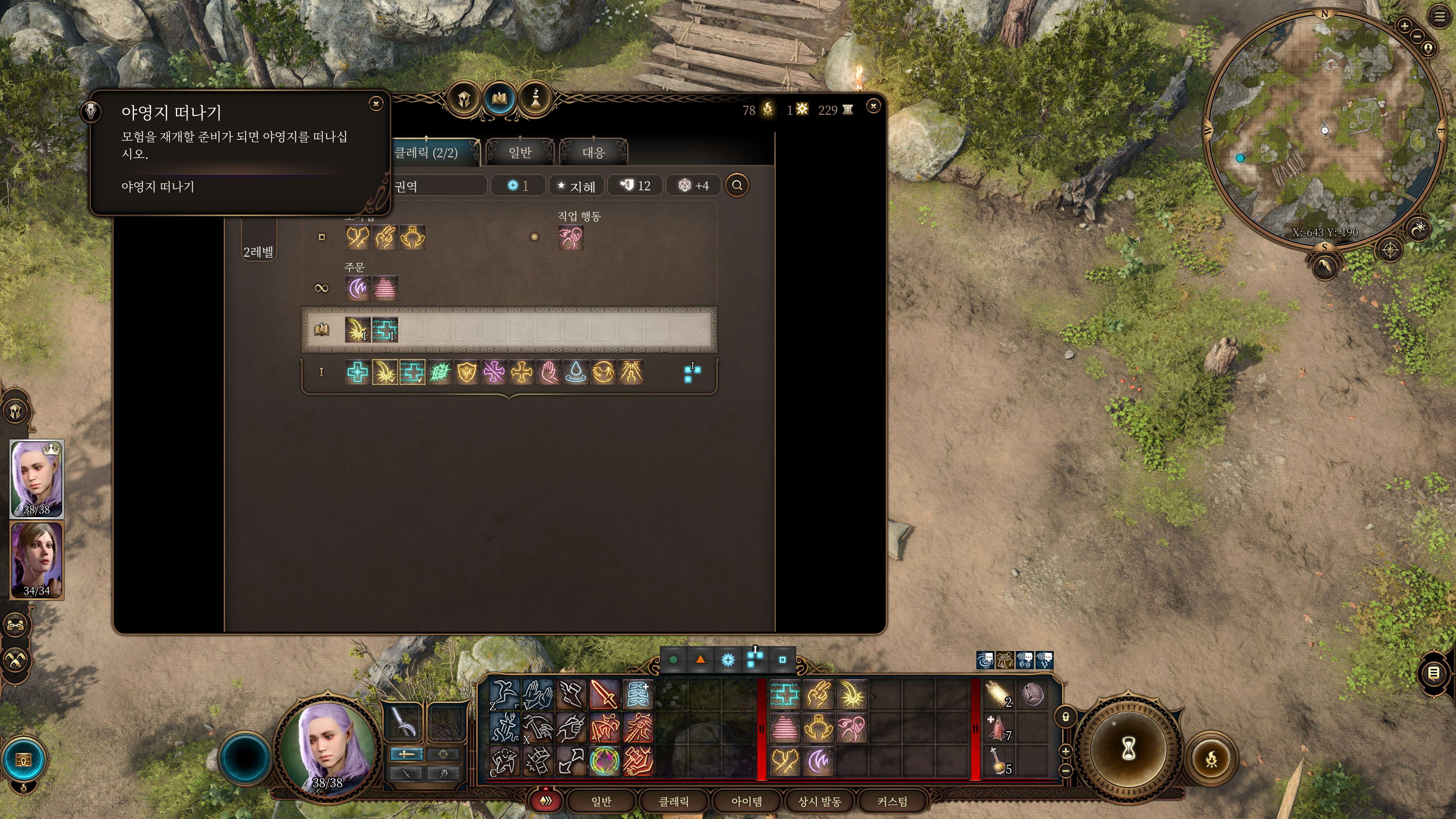 아래 쪽에는 선택된 캐릭터의 초상화와 무기, 행동/보조행동/소모품, 턴/실시간, 야영지 등의 인터페이스가 있다.