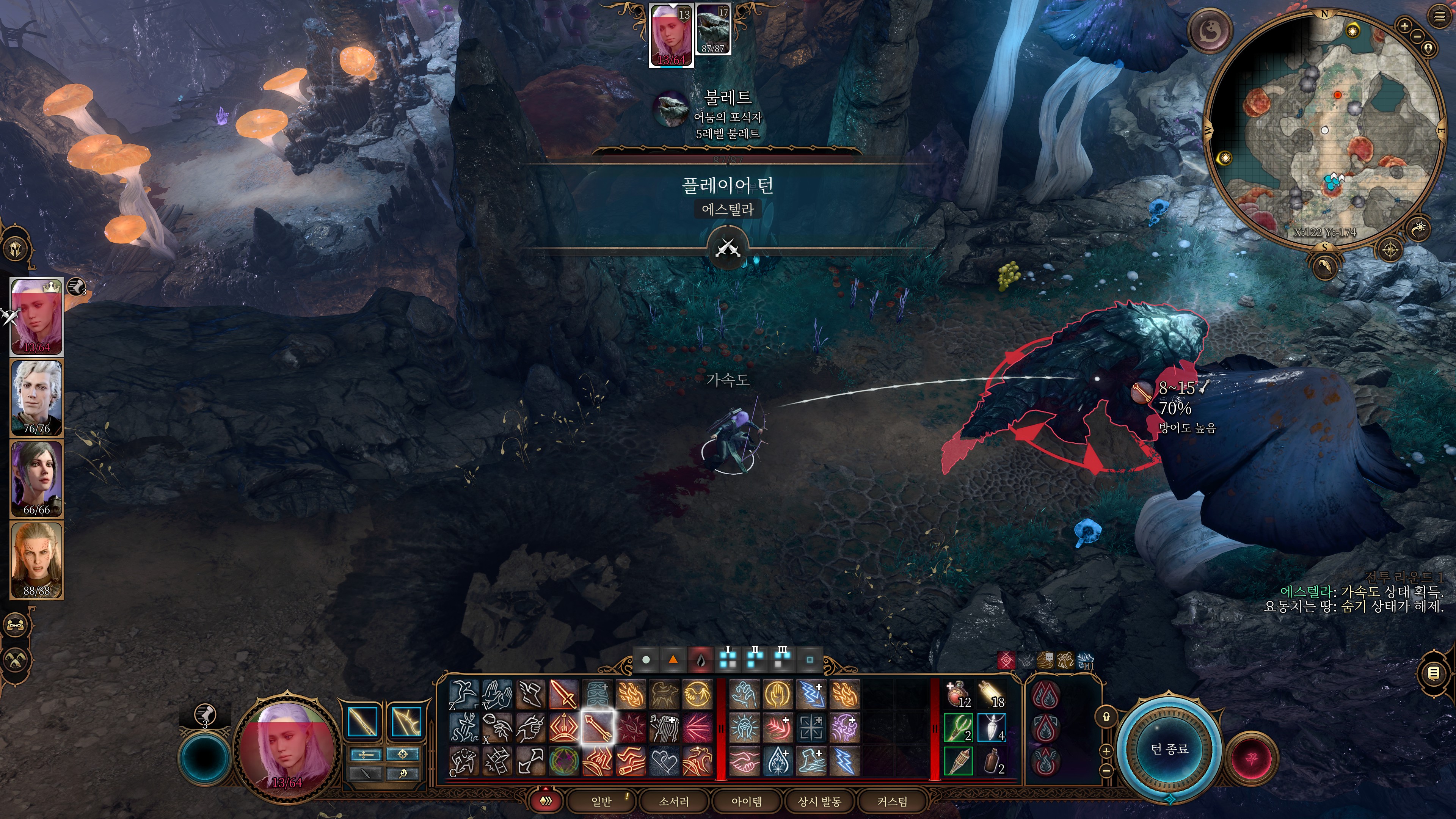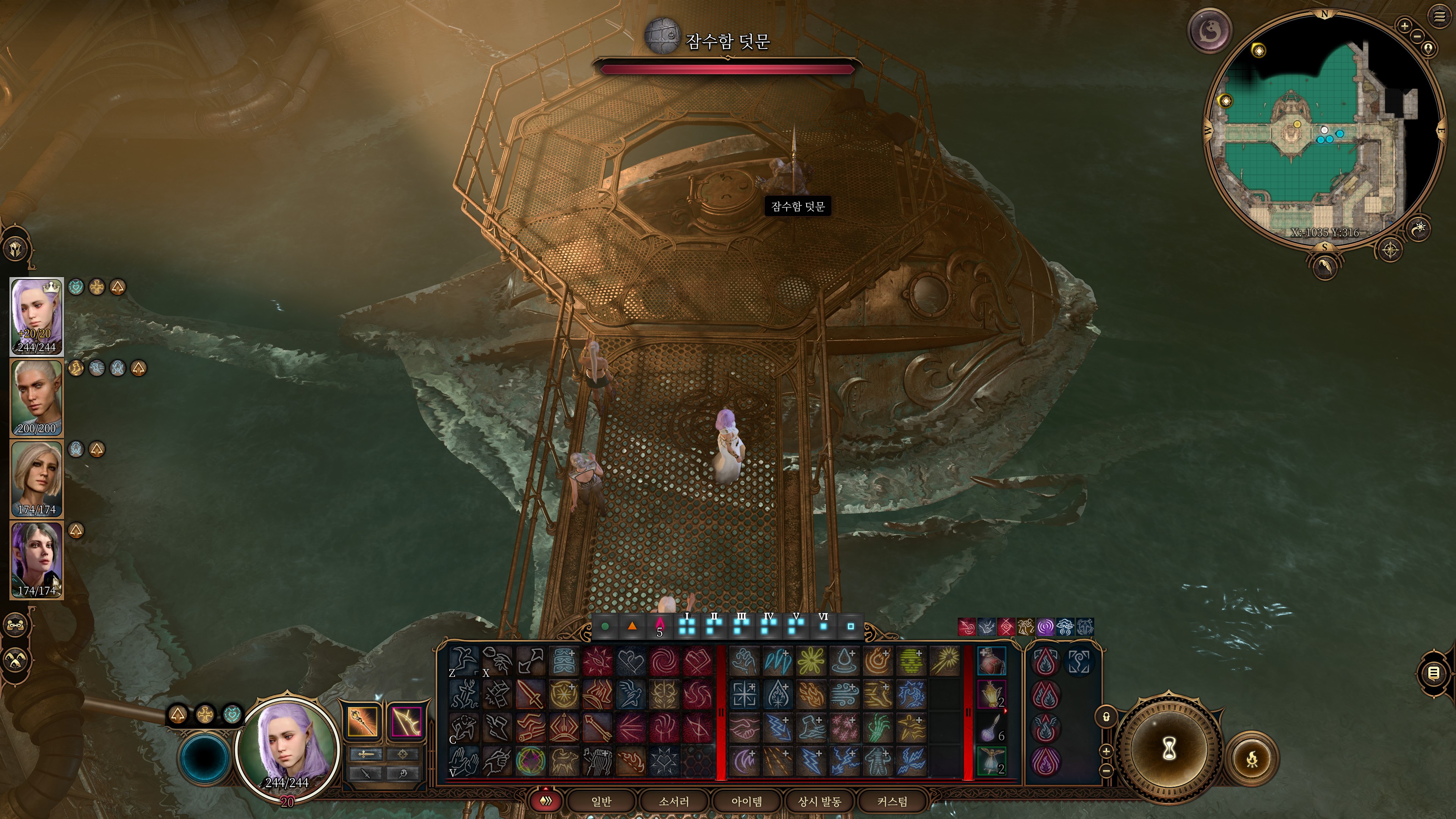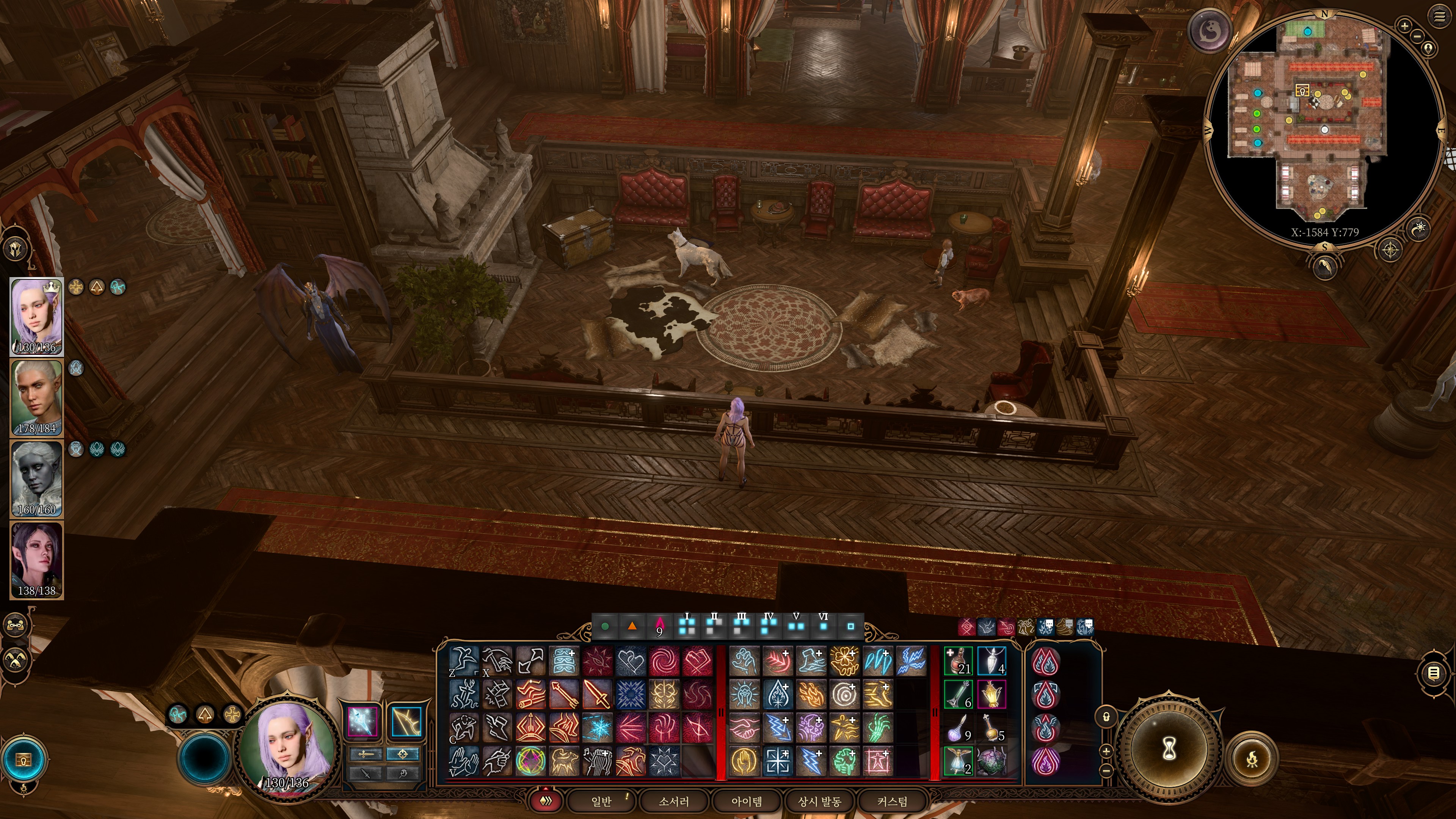 아래 쪽에는 선택된 캐릭터의 초상화와 무기, 행동/보조행동/소모품, 턴/실시간, 야영지 등의 인터페이스가 있다.
