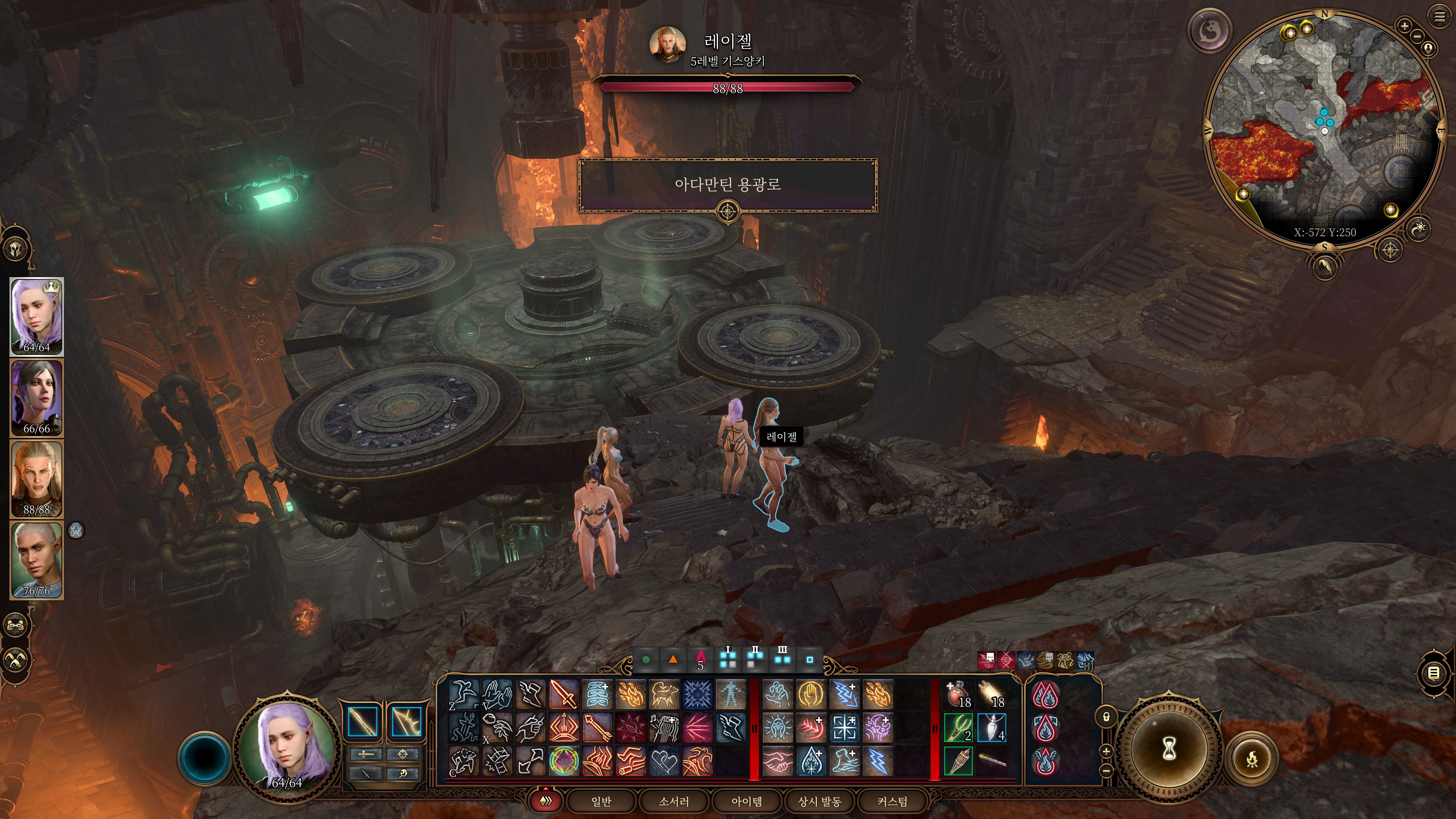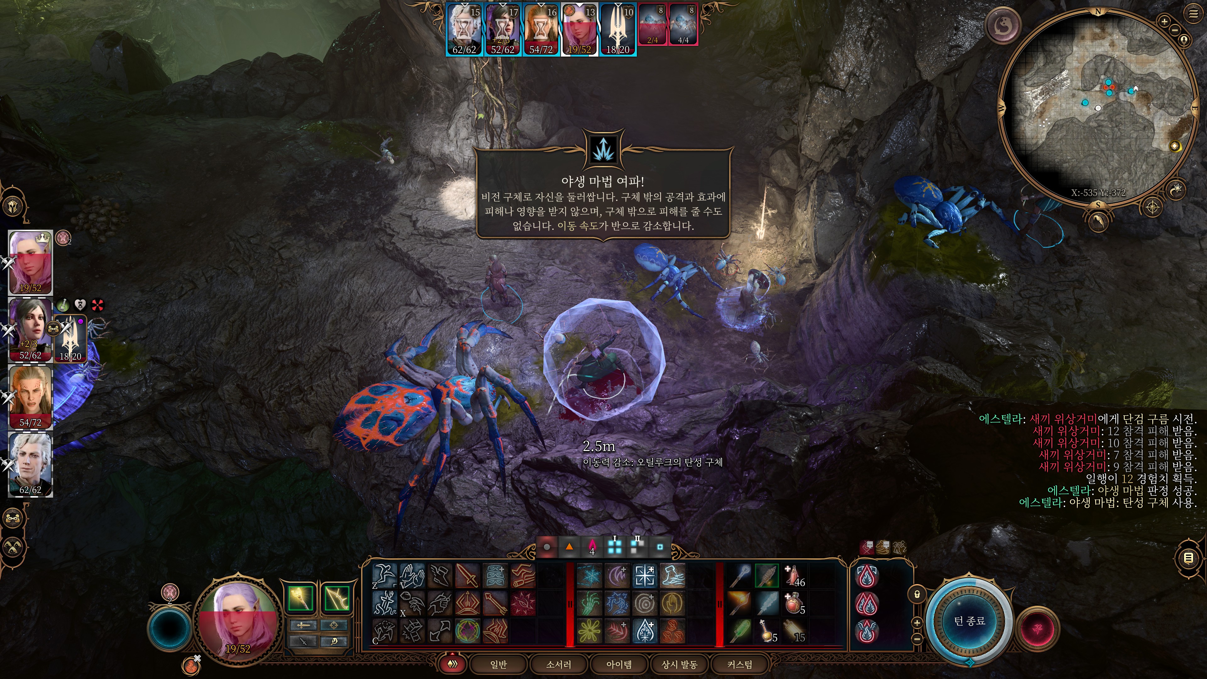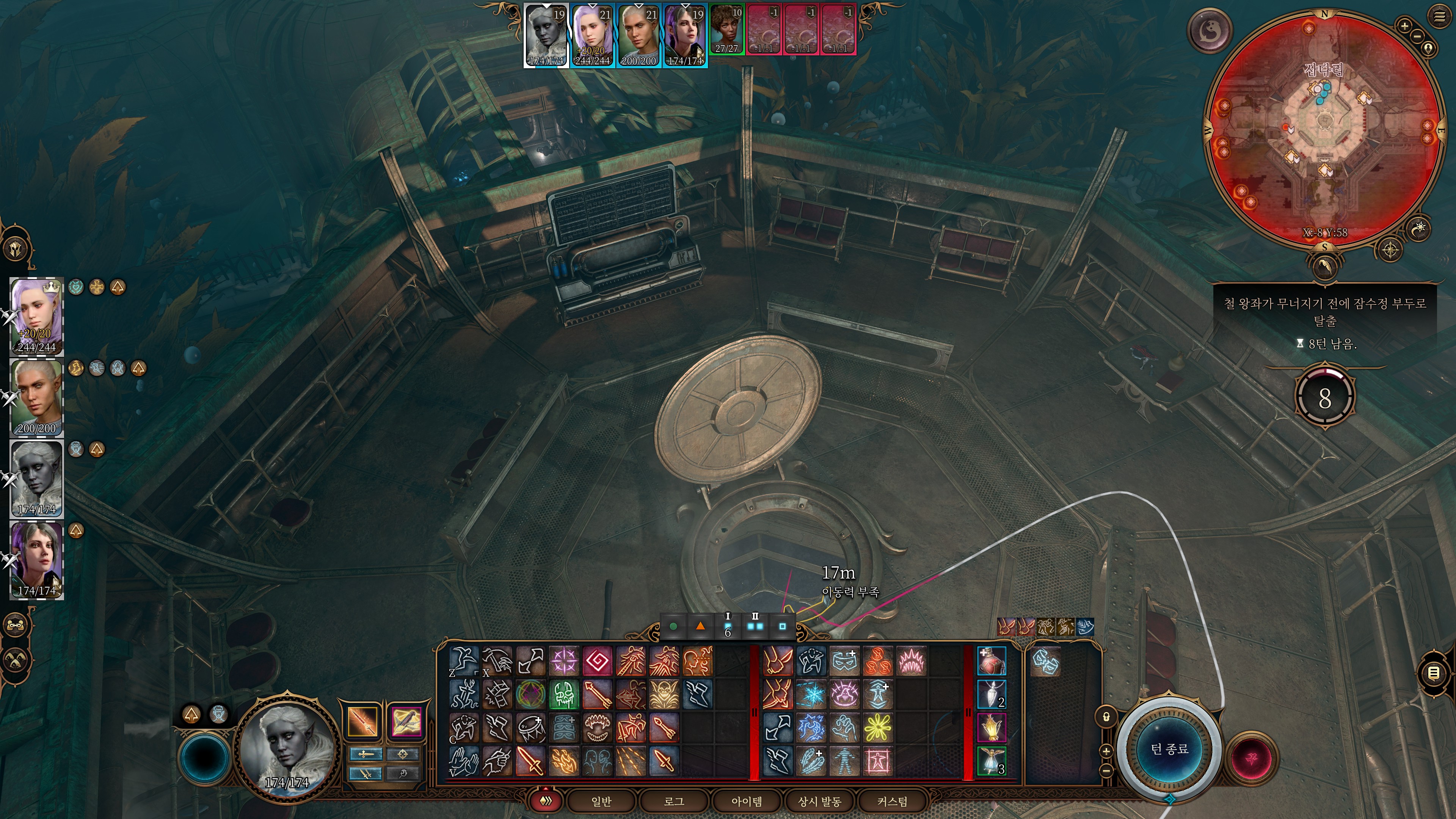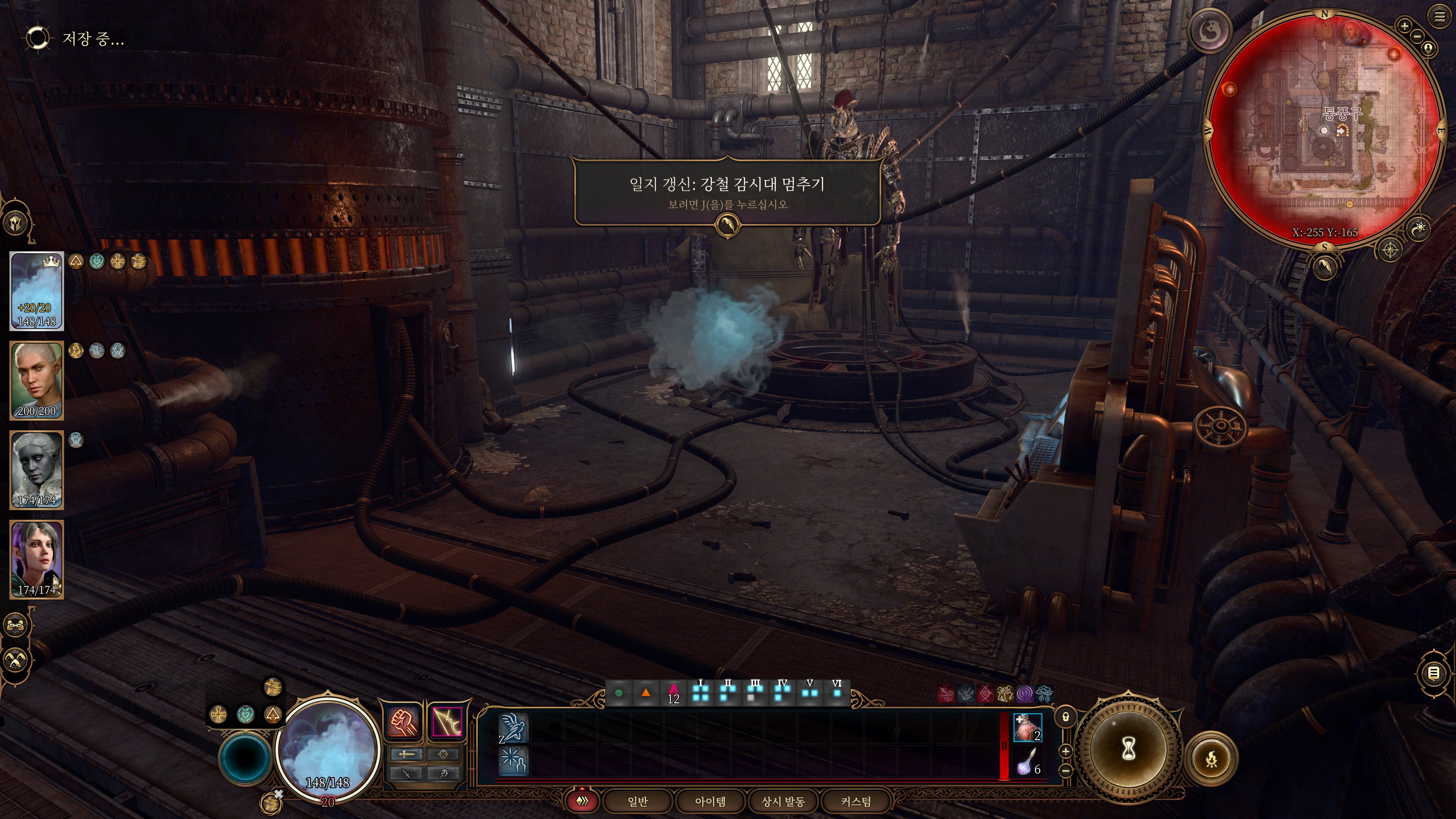 아래 쪽에는 선택된 캐릭터의 초상화와 무기, 행동/보조행동/소모품, 턴/실시간, 야영지 등의 인터페이스가 있다.