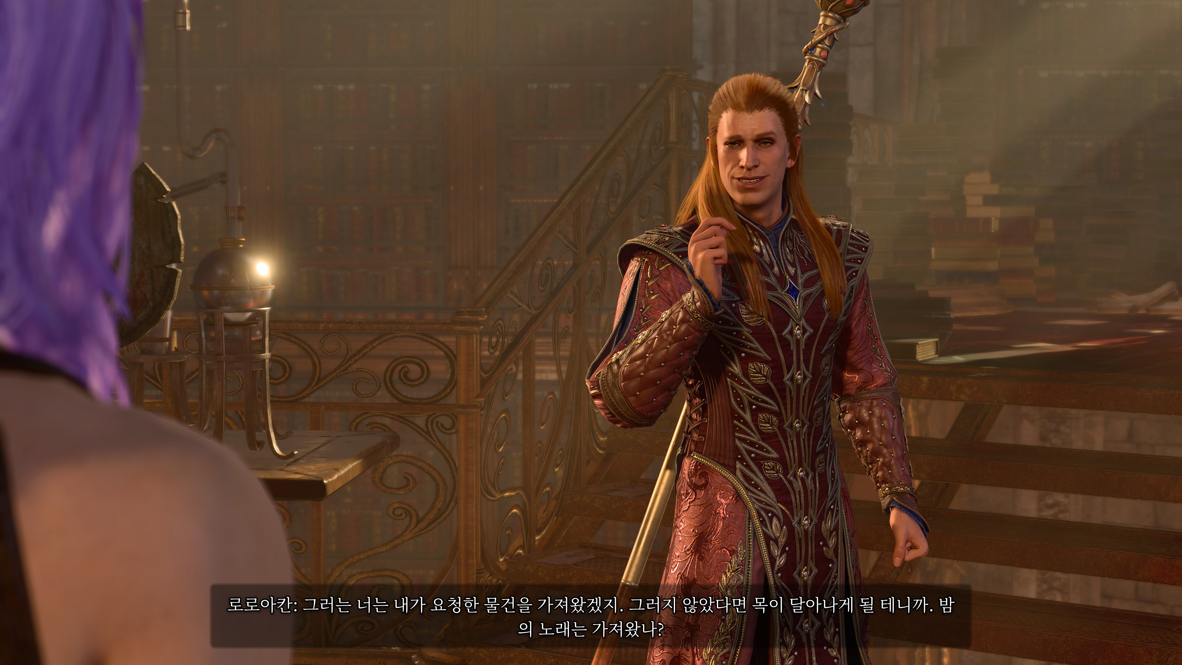 소서러 잡화점을 들렀는데 대마법사 로로아칸이 밤의 노래를 악용하려고 해서 밤의 노래 에일린을 데려와서 혼내줬다.