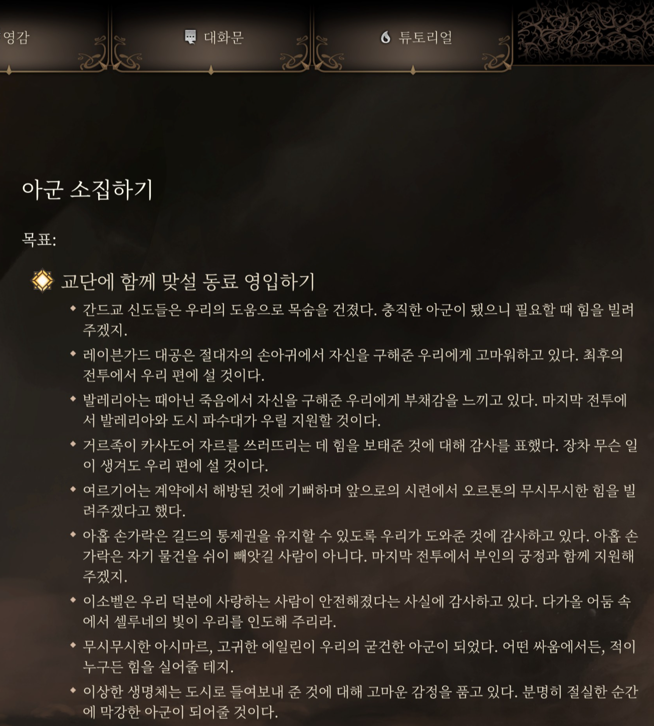 1막에서부터 수행했던 퀘스트 등을 통해서 수많은 아군들을 소집할 수 있었다.