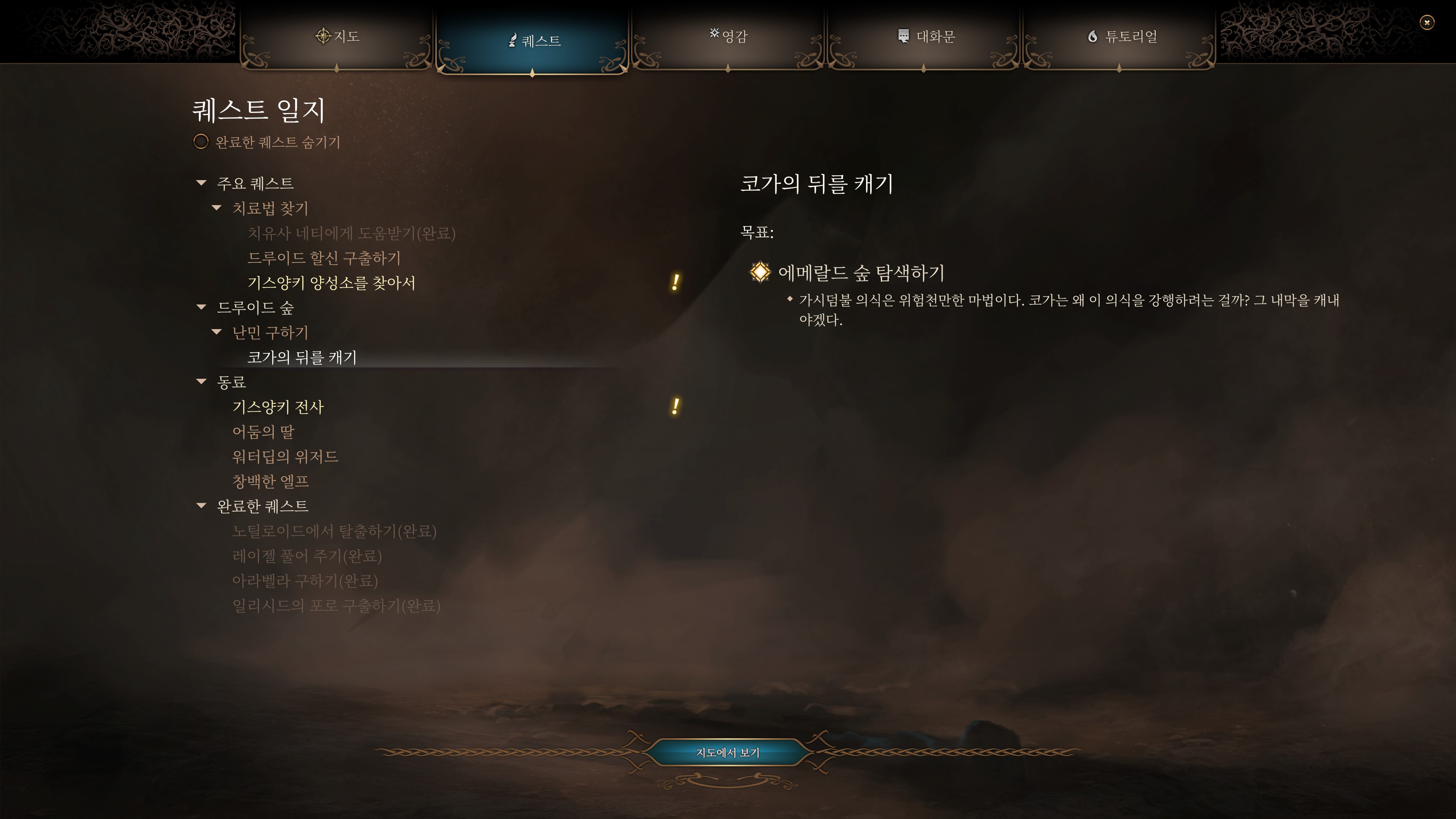 퀘스트 창에서 다양한 퀘스트들의 내용을 확인할 수 있다.