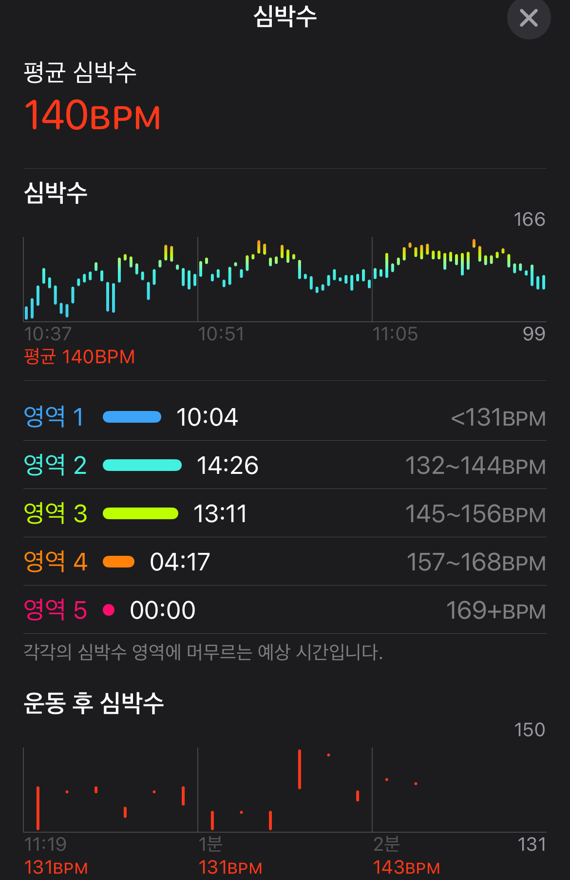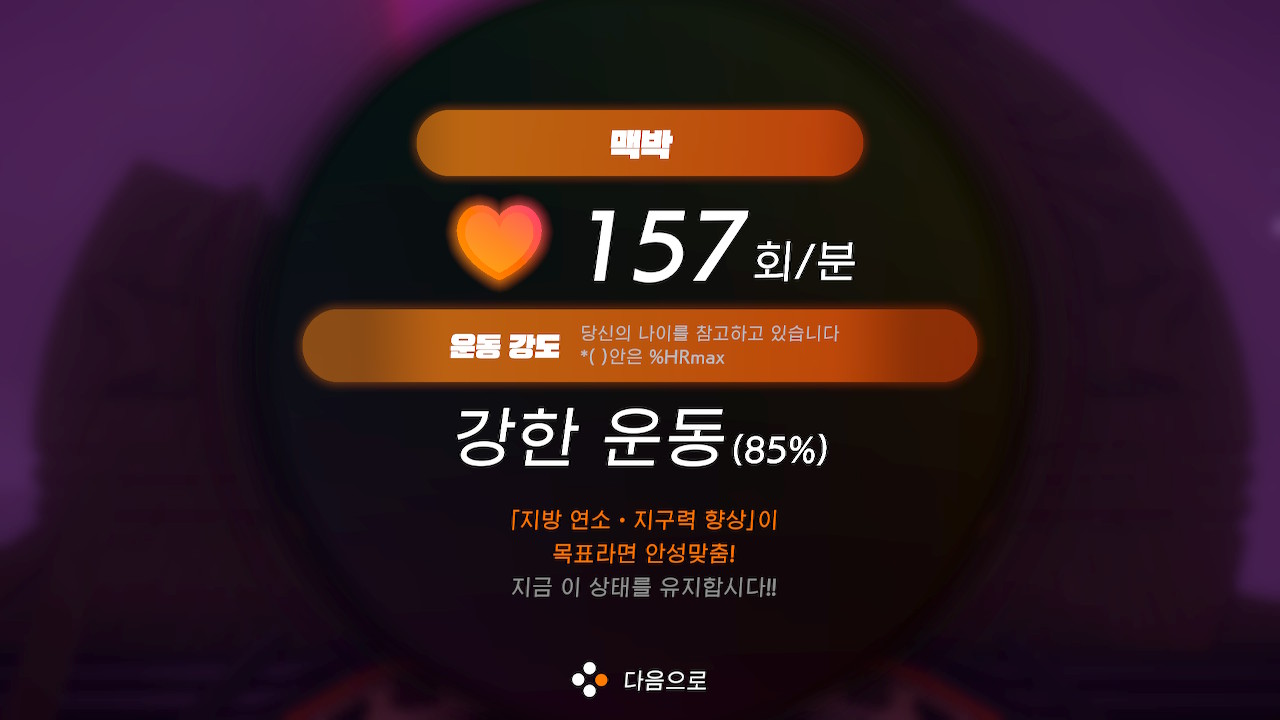심박수가 천천히 오르락내리락하다가 적당히 높게 유지되고 마무리 운동을 할 때 천천히 심박수가 내려갔다.