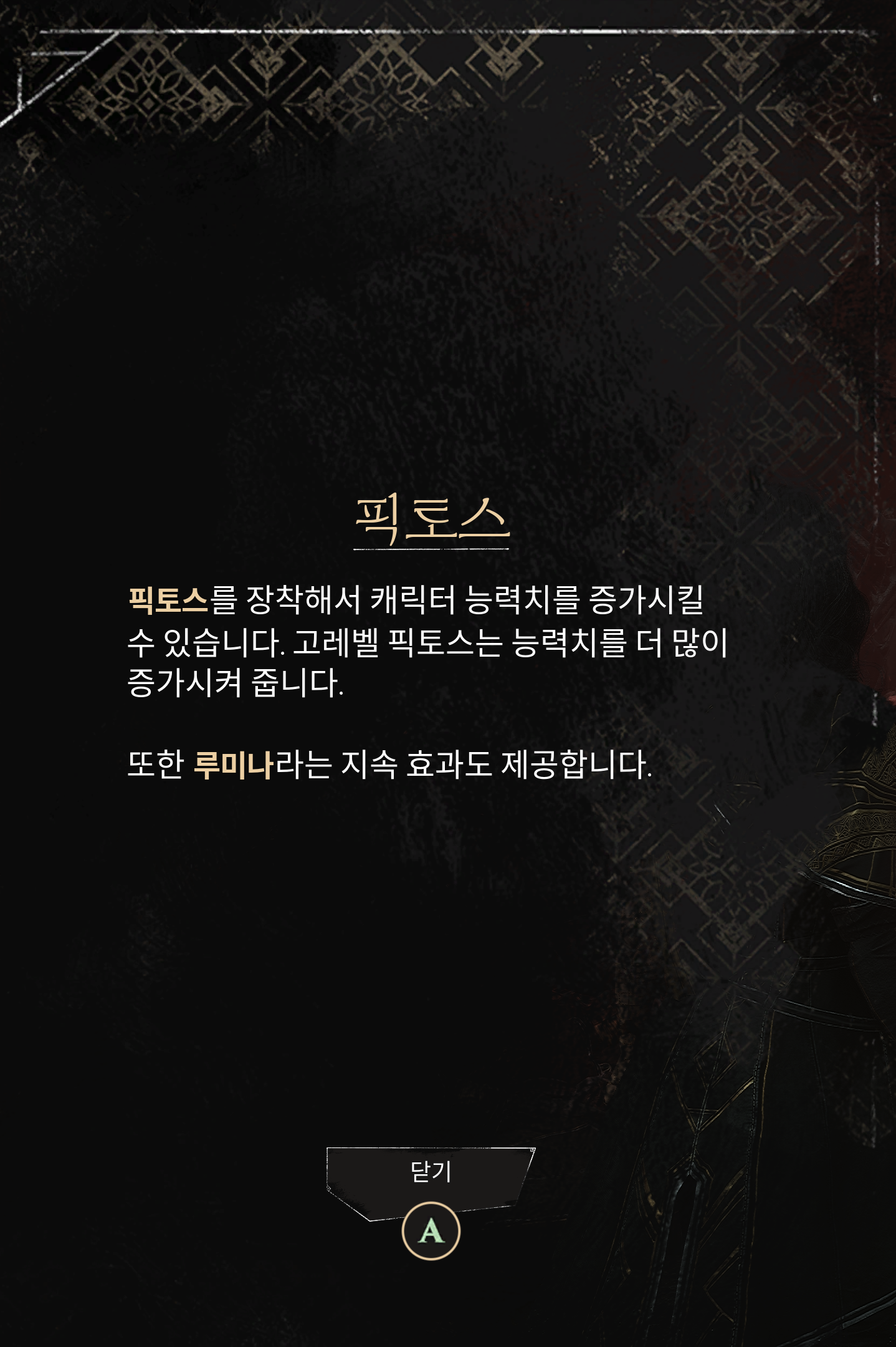 액세서리 역할을 하는 것 같은 장비인 픽토스를 획득했다.