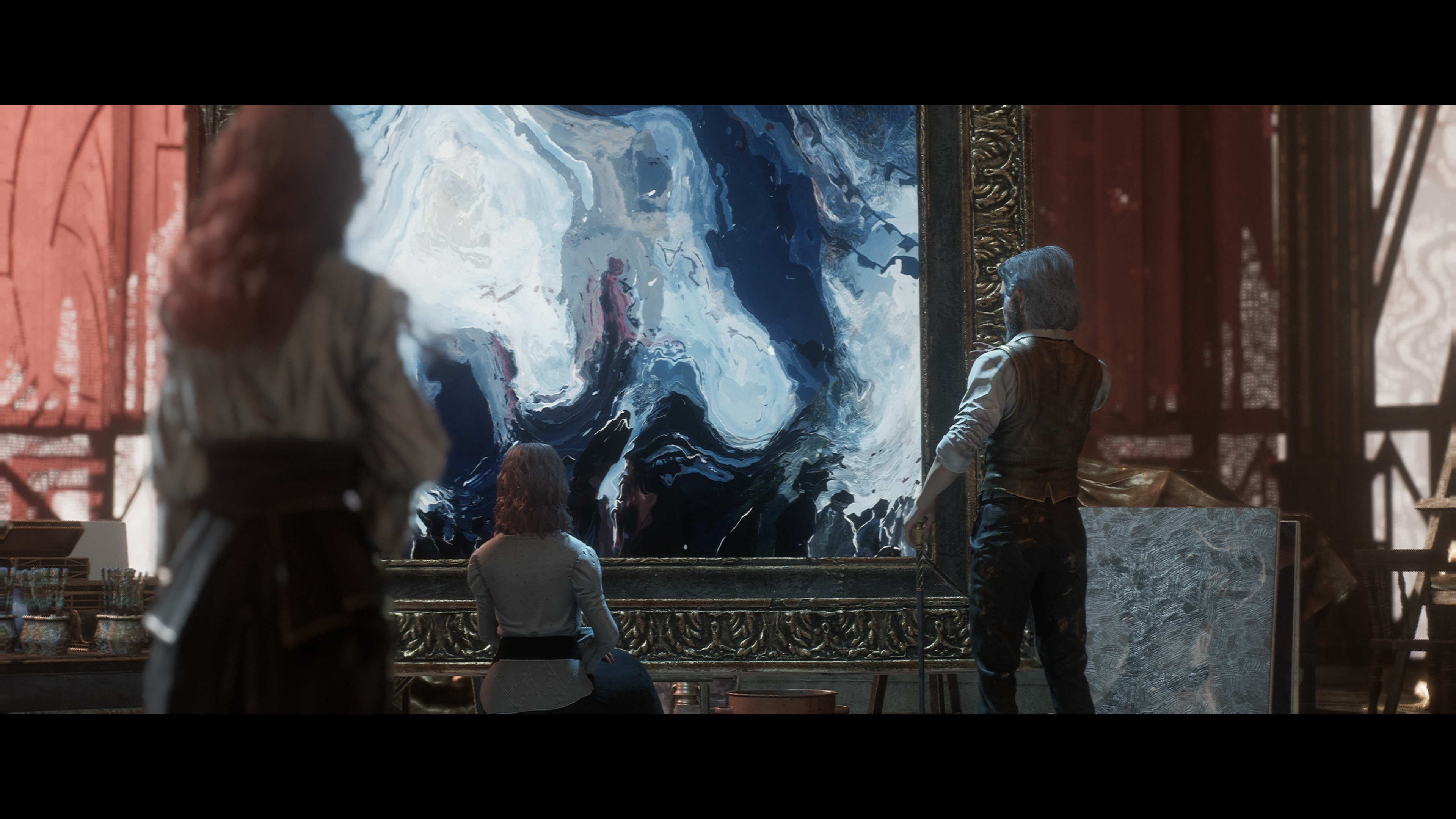 알린의 경우를 볼 때, 캔버스에 중독되어 현실을 외면할 딸 알리시아가 걱정되어 캔버스를 없앨 작정인 르누아르.