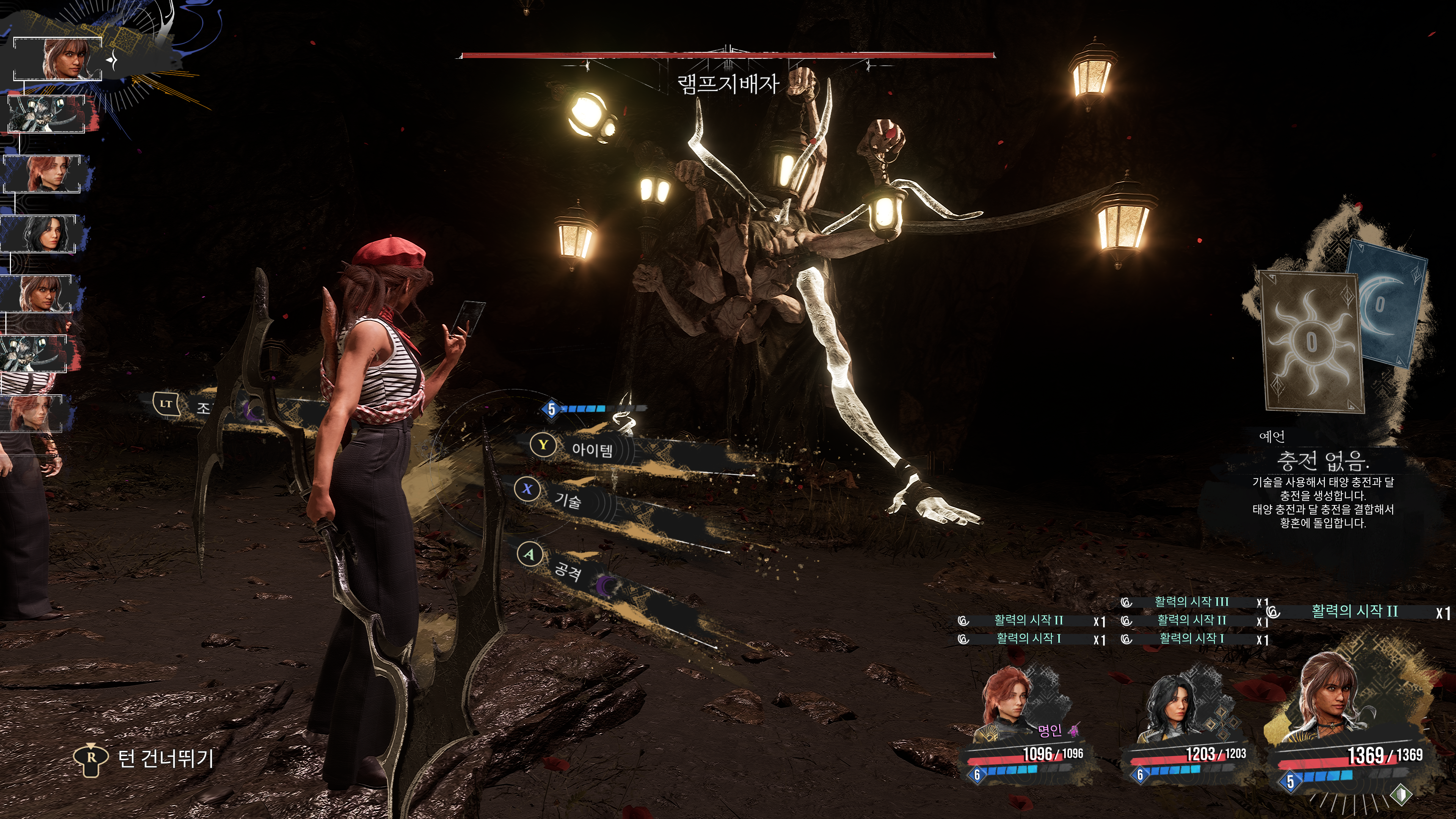 현재 장소와 목표, 파티원의 상태, 남은 영약의 상태 등을 확인할 수 있다.
