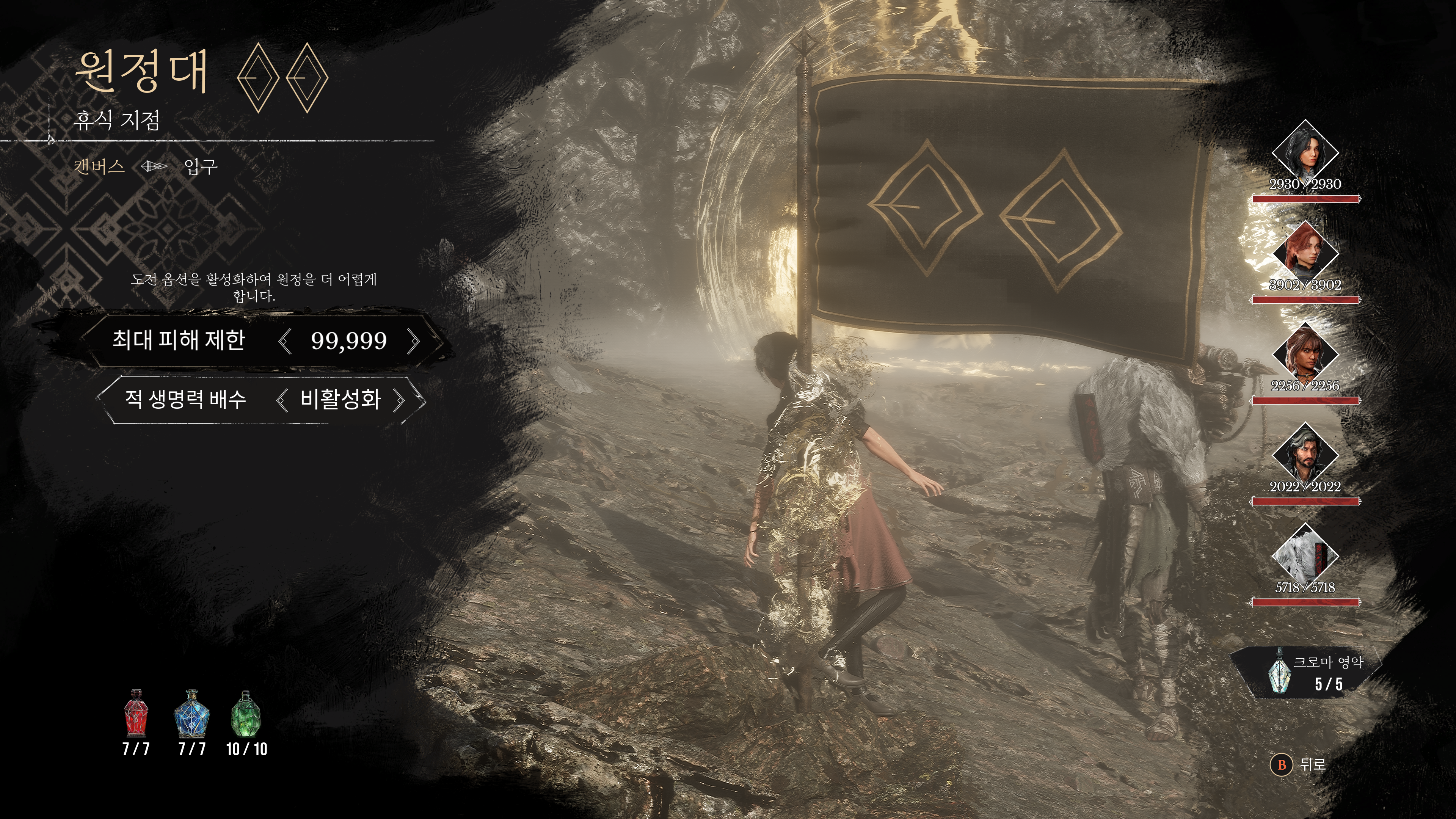 1 원정대가 설치한 깃발에서 휴식을 취하거나 능력치를 업그레이드하고 기술을 배울 수 있다.