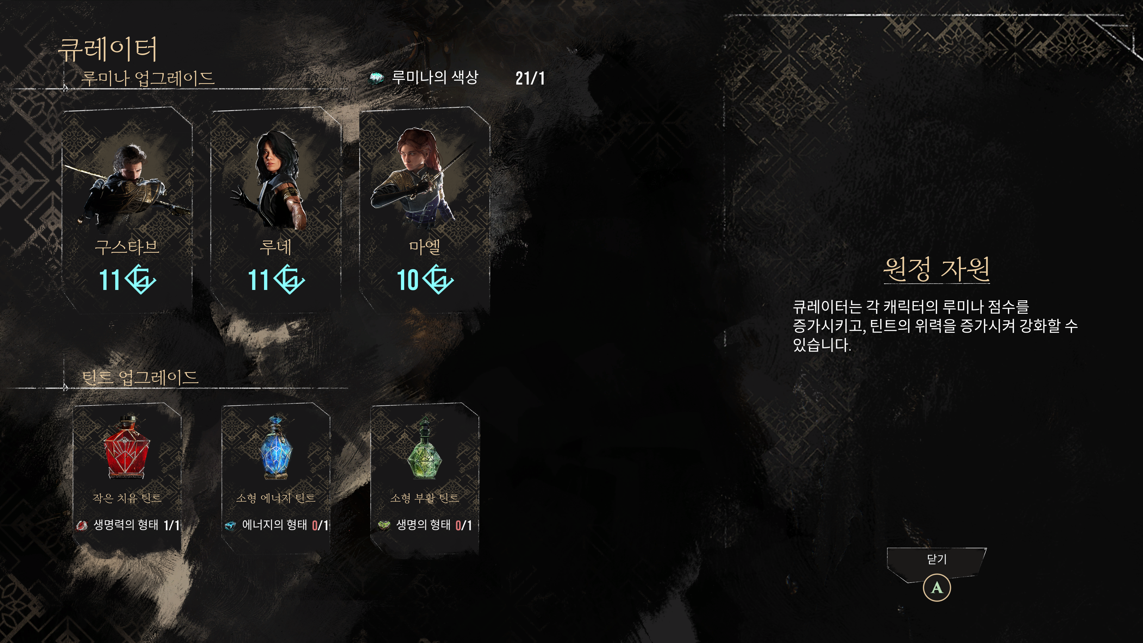 큐레이터를 통해 무기와 영약을 강화하거나, 루미나 점수를 올릴 수 있다.