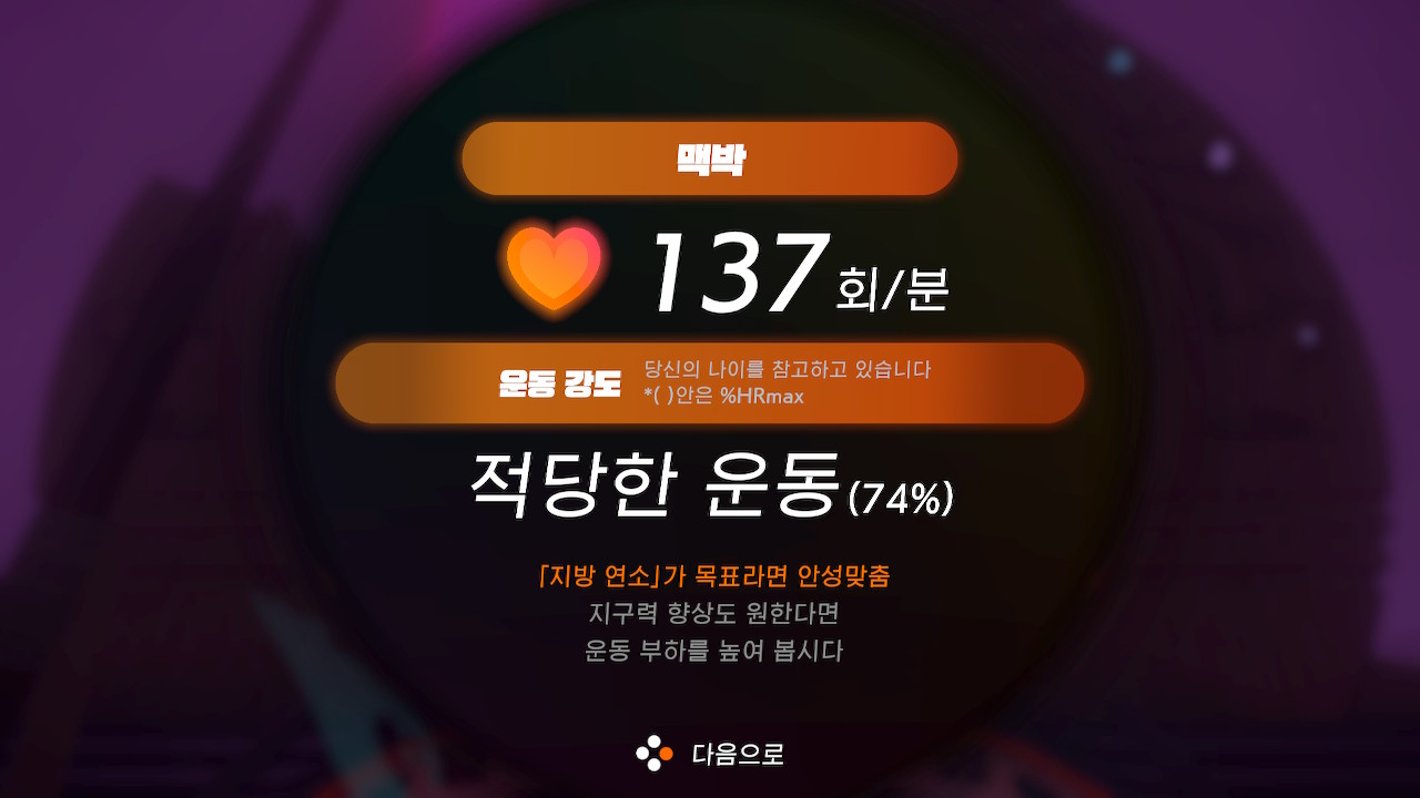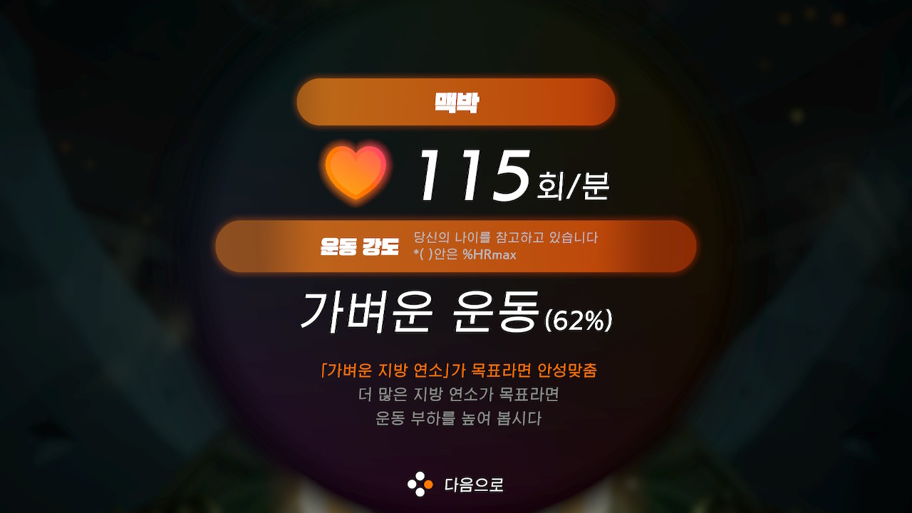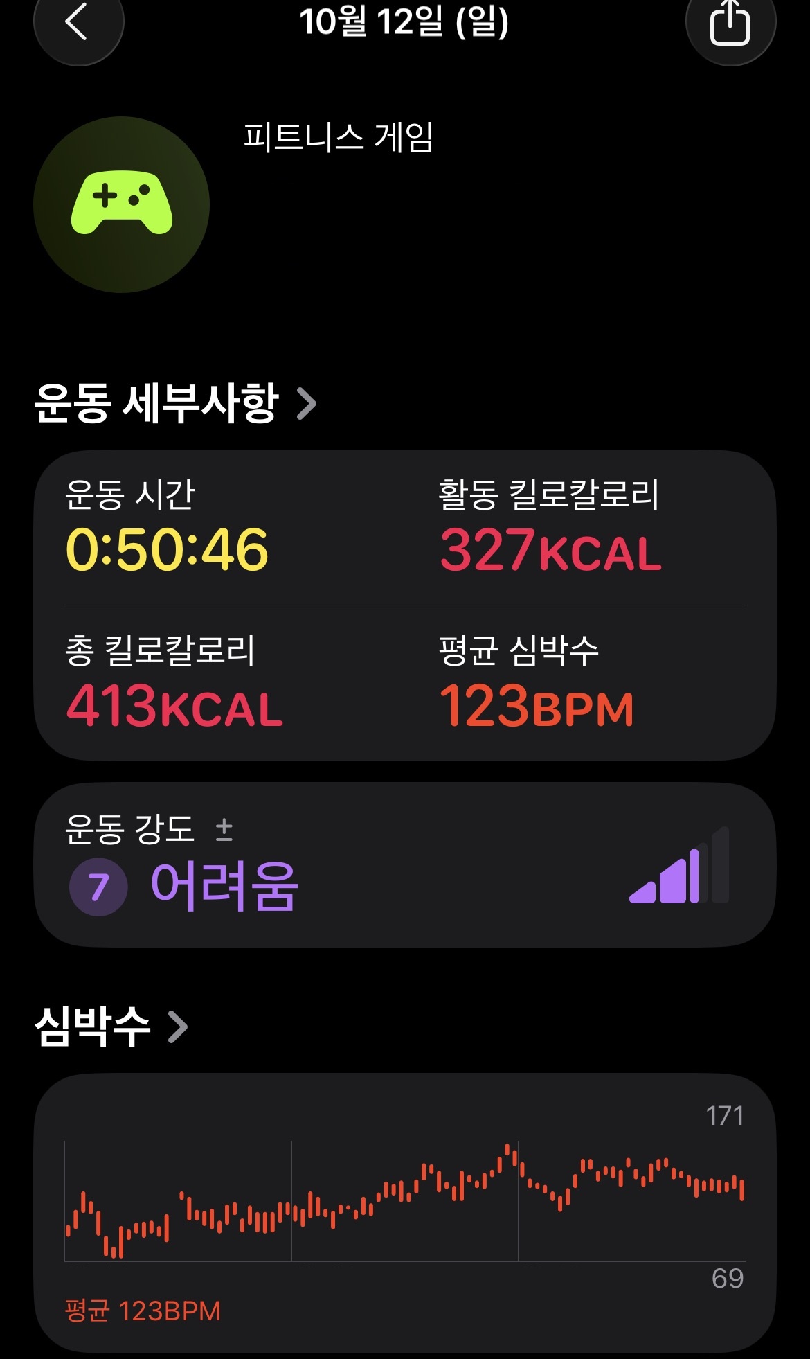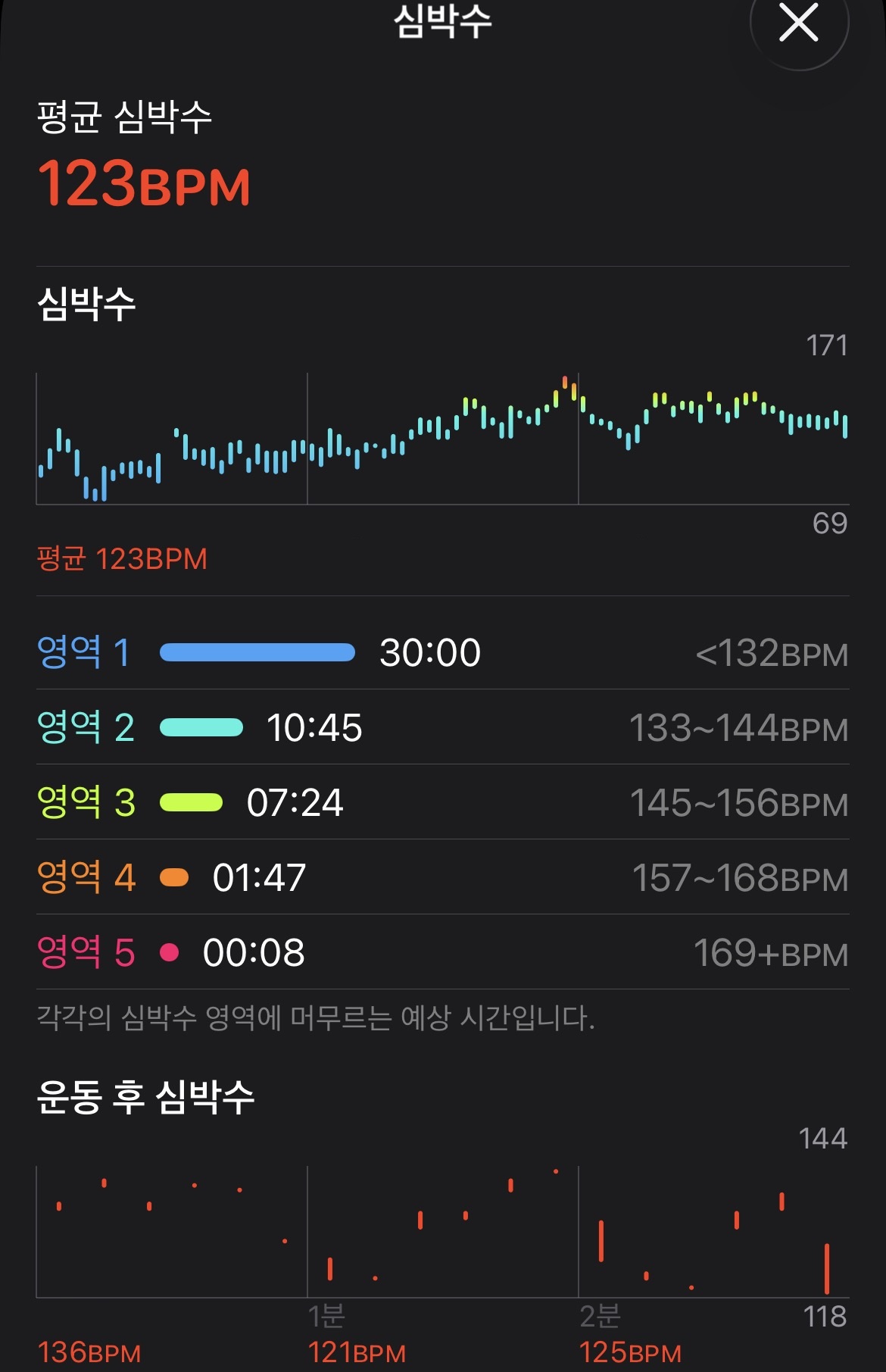오늘은 짐에서 게임하는 경우가 많아서 전체적으로 심박수가 크게 오르지 않았다.