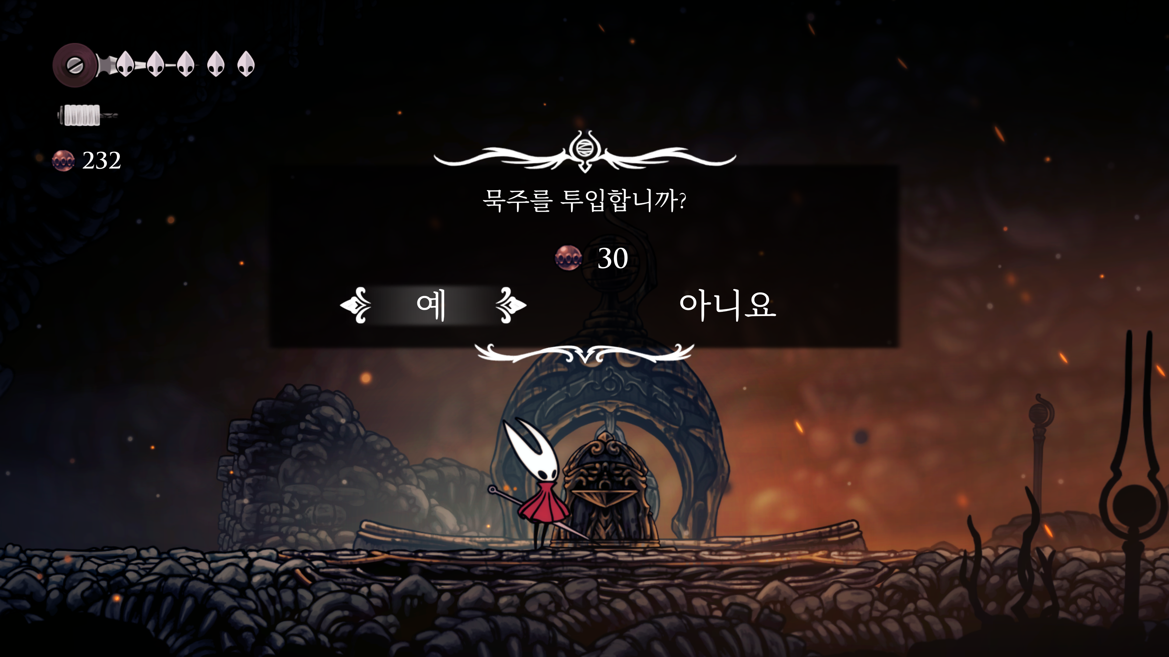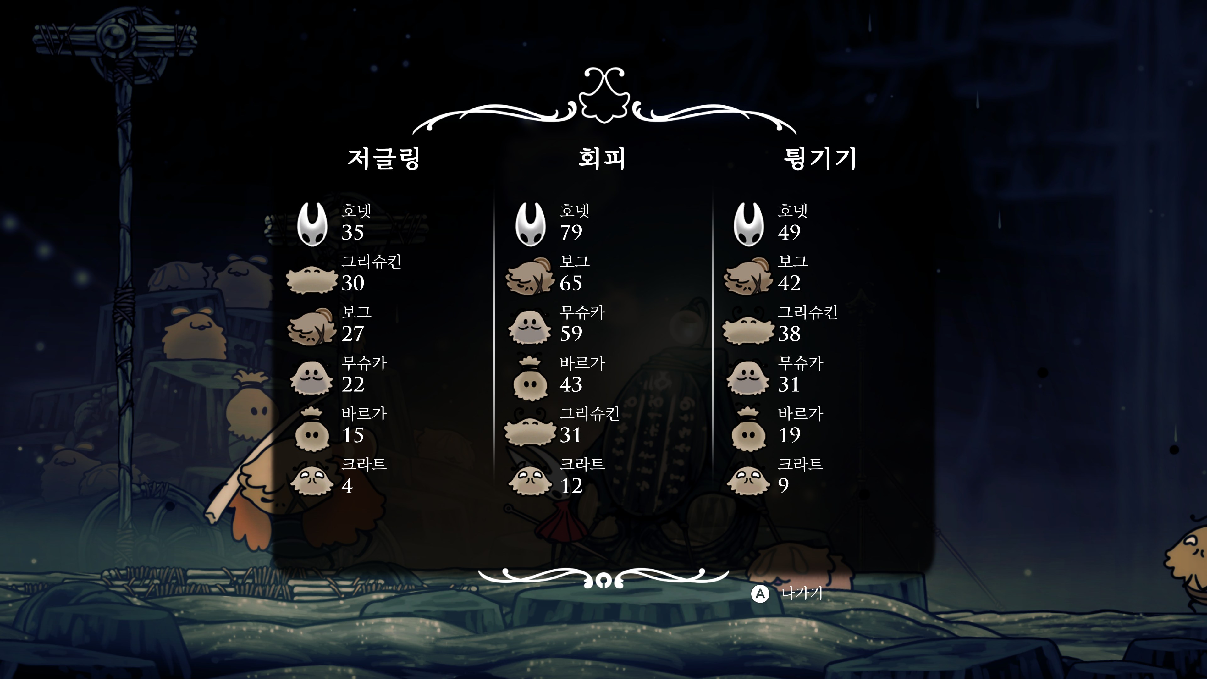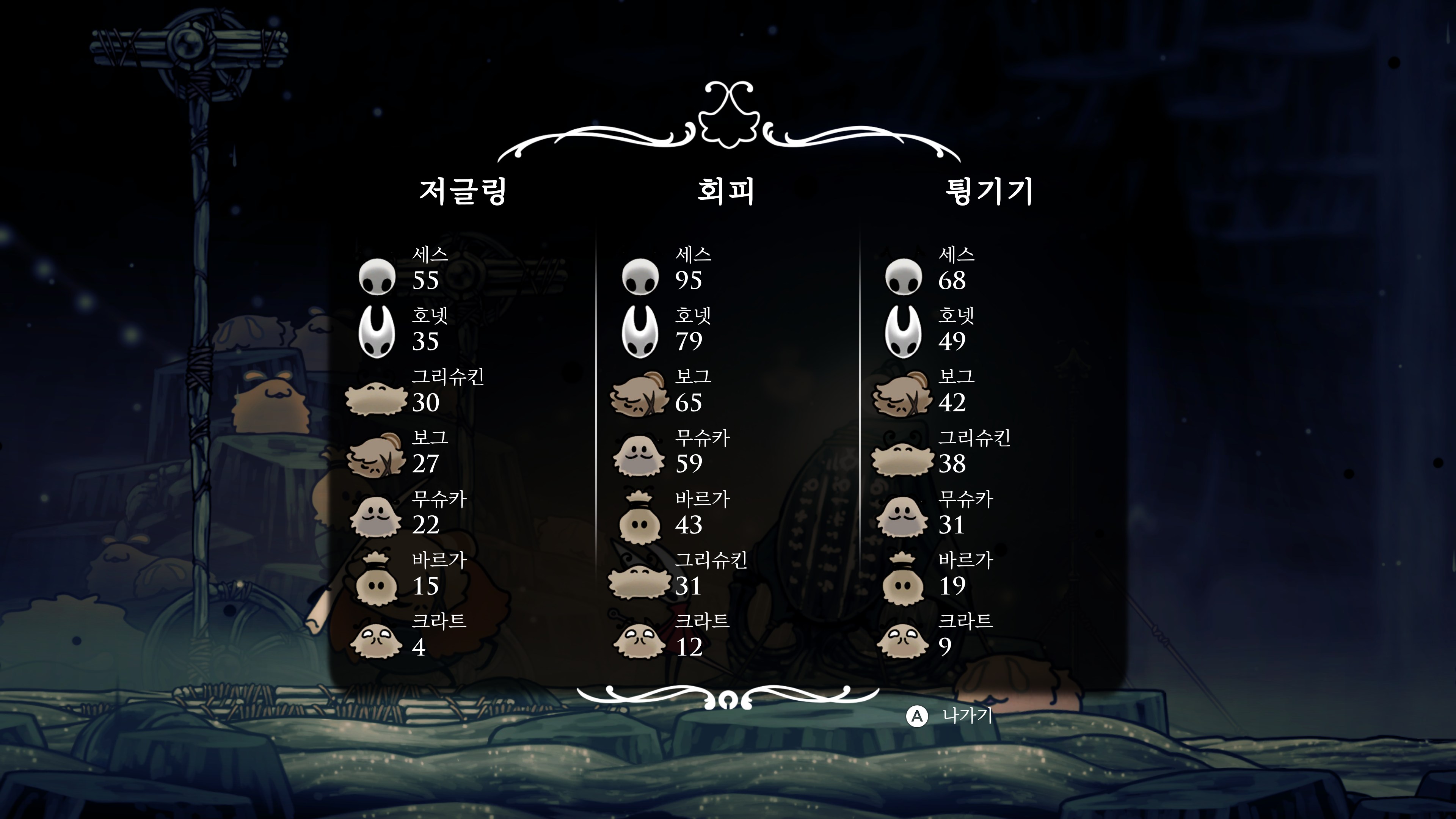 메트로베니아를 제대로 플레이한 게 할로우 나이트가 처음인데 자원을 잃고 하는 게 조금 스트레스였고 다른 건 괜찮았다.
