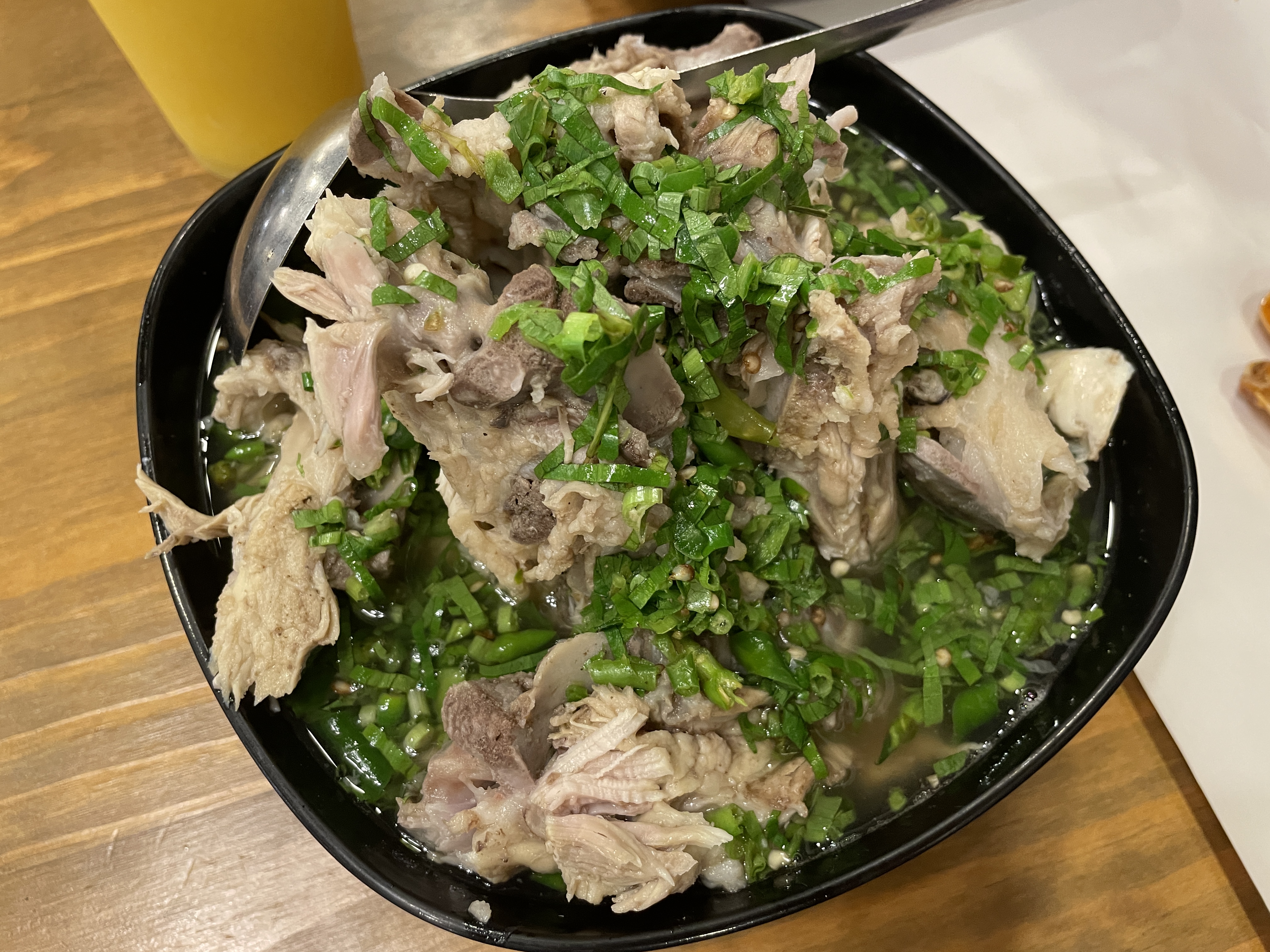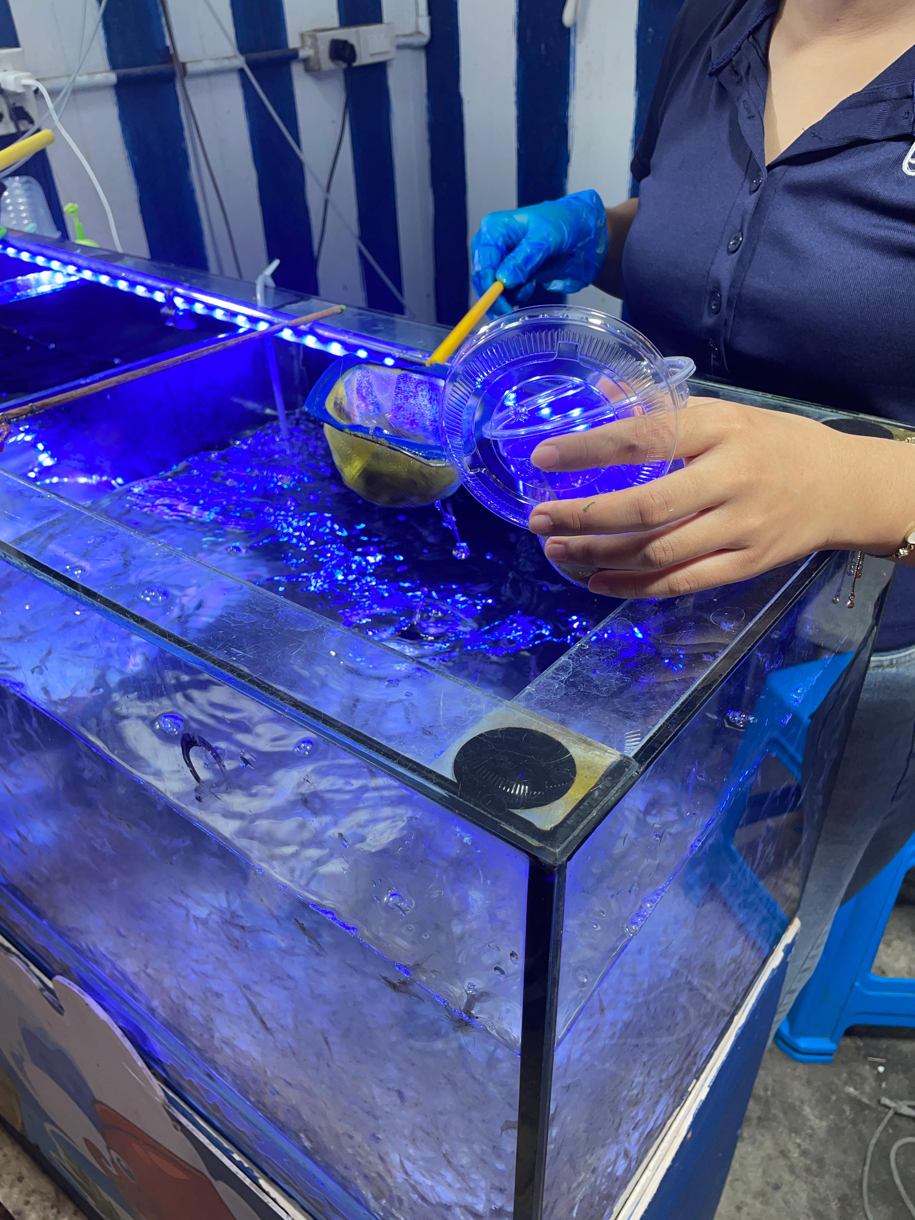 작은 민물 새우를 생으로 매콤 새콤한 양념과 같이 먹는 메뉴다.