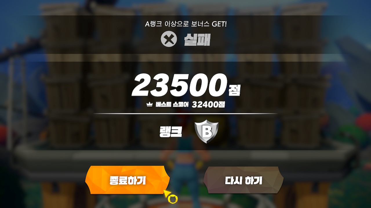 상자를 많이 못 부숴서 처음에는 실패하고 두 번째에 성공했다.